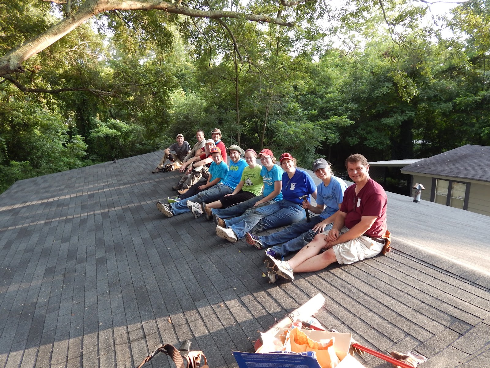 After a short lunch break back at First Pres. (Where Nathan finally agreed to have a second sandwich, justifying it by saying "Treat yo self!"), we got back to work for the final stretch. We couldn't have done it without such a great, cohesive team, always willing to take on a new task and working together to create efficient methods of getting everything we needed done. Ashley was bouncing around everywhere, Gwen was hammering nails like a pro (roofing nails and fingernails), Ginger and Megan were cutting shingles until their hands went numb, and Ron was all over the place making sure everything was being done properly. The Lord was good and kept a storm that was headed our way from becoming an obstacle, and around 6:30 we were finally finished. After pictures on the roof and with Mrs. Carson, we headed back to the church for hearty feast.